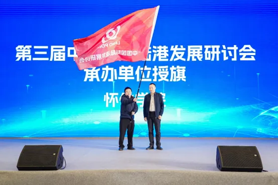 在授旗环节,由怀化学院数字经济与管理学院副院长李荣代表第三届中国国际陆港发展研讨会承办单位——怀化学院,接过旗帜,让我们相约2026,相聚五溪之地。